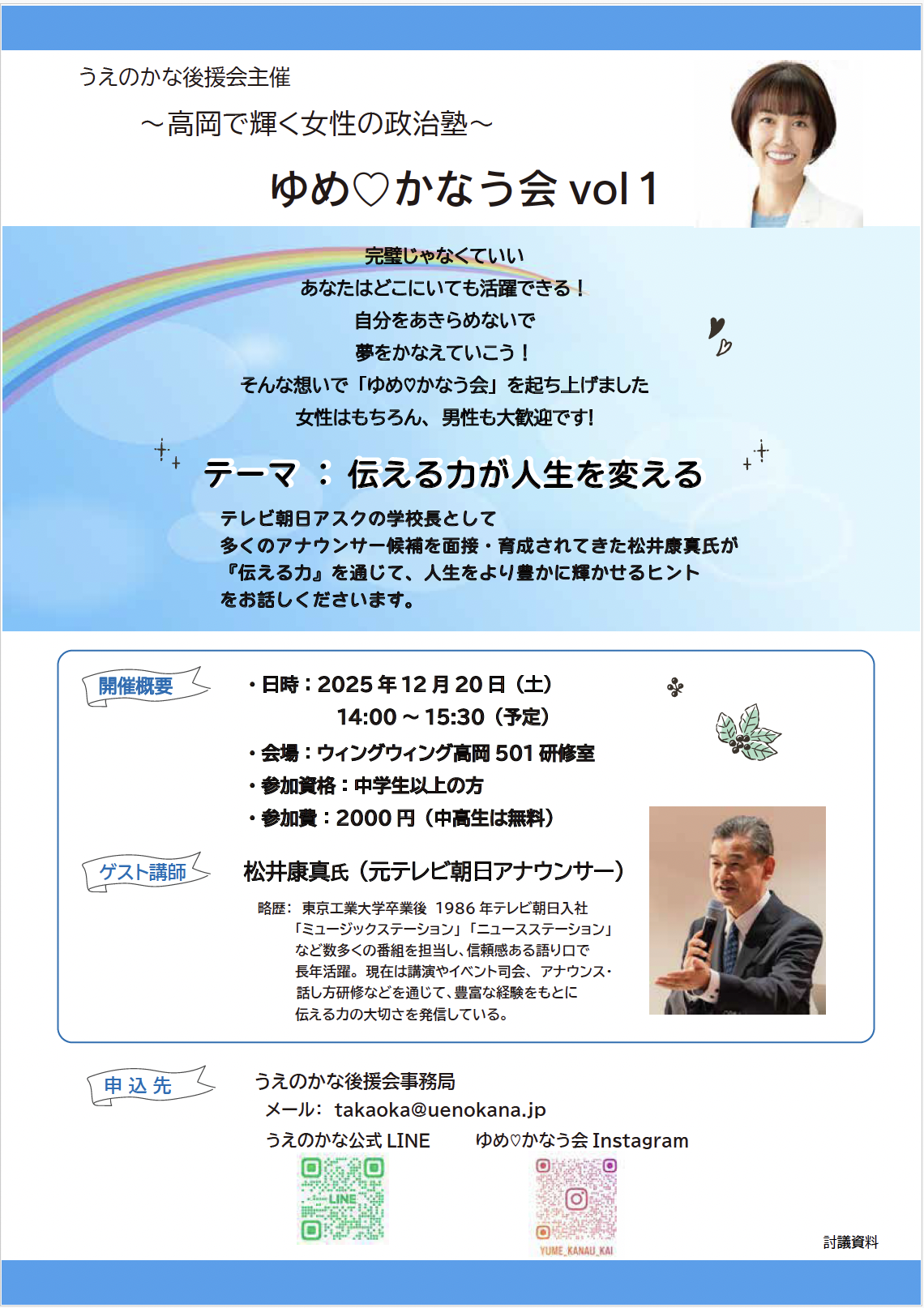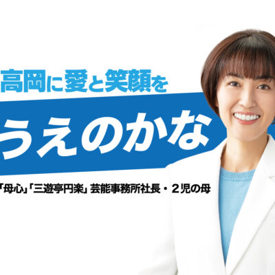 高岡市議会議員うえのかながお訴えをする政策 「愛と笑顔を呼び込む3つの約束」です。